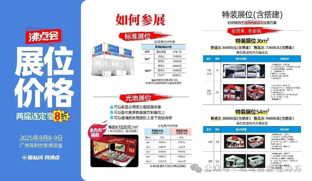 光地展位(推荐大品牌):54㎡起,普通区64,800元,爆品区71,280元(+10%);