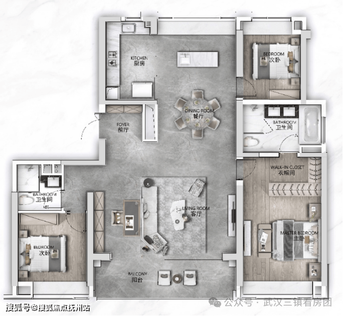 270°转角阳台,方正空间布局,南北双阳台酒店式双套房设计,建面约43㎡主卧尺度双衣帽间、主卫双台盆及五件套约5.1米客厅开间,阔藏大师园景U型中厨,西厨独立岛台,无国界烹饪之遇