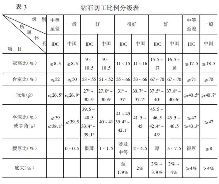 在HRD和我国钻石切工比例分级标准中,参与等级划分的参数主要有:冠高比、台宽比、亭深比、腰厚比、冠角和底尖。其分级等级可划分很好、好和一般(中等至差)三个等级。