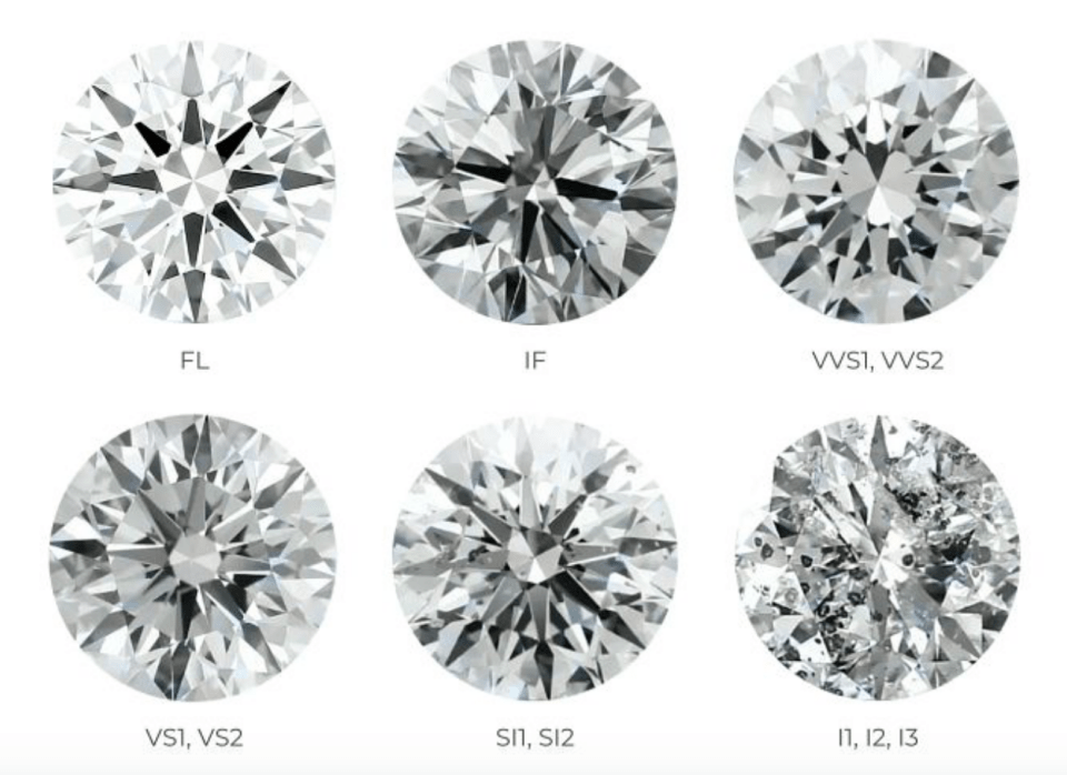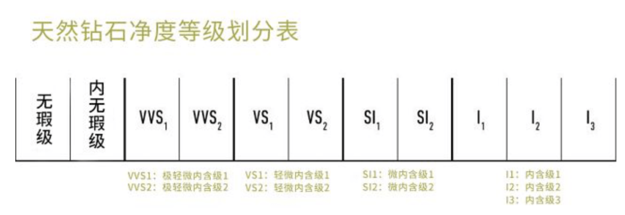 天然钻石净度分级范围从FL (无暇级) 到I3 (内含级),共有11个等级,具体可见下表。