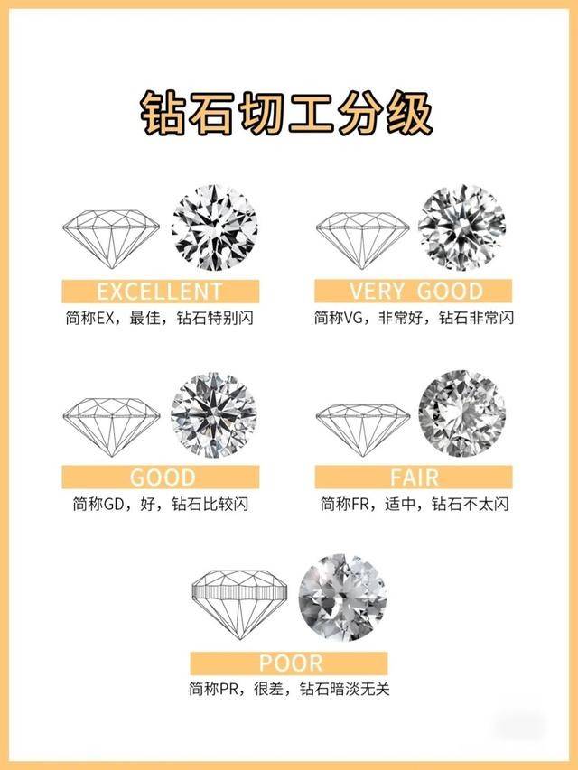 钻石的切工决定了天然钻石刻面与光线的相互作用,从而决定了天然钻石的闪耀程度。切工等级根据对称性、抛光度和切割比例这三个方面来分,每一项都有五个级别,从高到低依次是EXCELLENT、VERY GOOD、GOOD、FAIR、POOR。
