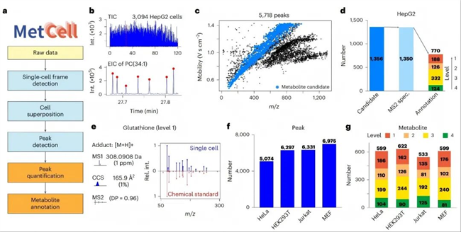 由于单细胞代谢数据量巨大以及数据的特殊性,研究团队自研了针对离子淌度质谱的单细胞代谢数据分析平台MetCell,能够一站式完成单细胞数据采集、细胞叠加、峰检测、峰定量、代谢物注释全流程工作(图4a)。在对HepG2细胞系的120分钟的检测时间内,共采集到3094个细胞(图4b),在单个细胞中检测到5718个代谢物(或特征峰),并通过MS1和CCS值鉴定出了其中的1356个代谢物(图4c),并对其中的1350个代谢物进行了MS2鉴定,按照MSI(国际代谢组学标准倡议)的标准分别鉴定出了,188个Level 1代谢物、126个Level 2代谢物、332个Level 3代谢物和124个Level 4代谢物(图4d)。研究团队同时使用该平台测试了其他不同的细胞类型,分别检测出了5074-6975个代谢物(或特征峰),并通过MS2鉴定出了其中的533-622个代谢物(图4f,g)。值得注意的是,本次跨细胞研究有389种代谢物使用了化学标准品进行了验证,是迄今为止所有单细胞代谢研究中报道最多的,而其他方法,目前还仅仅停留在MS1鉴定水平,少量MS2匹配也基本没有使用化学标准品进行验证。