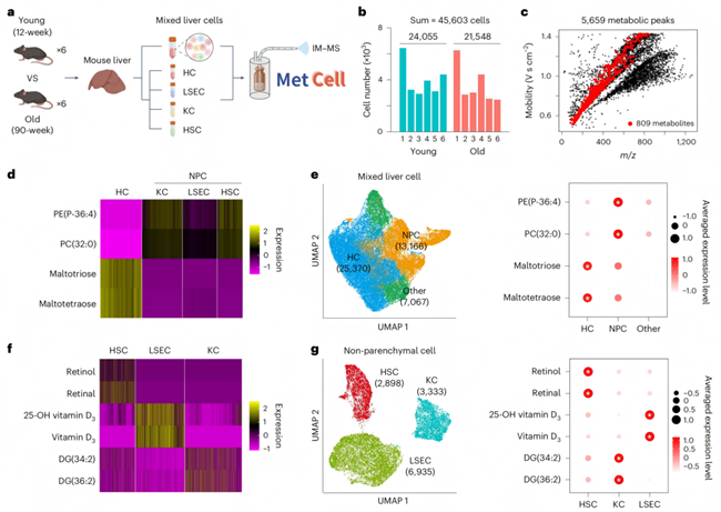 最后研究团队使用离子淌度质谱流式技术对衰老小鼠肝脏进行了大规模单细胞代谢组学研究,成功实现了代谢物在细胞类型注释中的应用。研究团队分别收集了年轻组和老年组小鼠样本(图6a),通过单细胞代谢技术,共采集到45603个细胞,其中年轻组24055个细胞,老年组21548个细胞,共检测到5659个代谢物(或特征峰)并鉴定了其中的809个代谢物(图6b,c)。为了研究不同的肝细胞类型,研究团队分离了四种主要的肝细胞类型,肝细胞、肝窦内皮细胞(LSECs)、库普弗细胞和肝星状细胞(HSCs),并通过单细胞代谢技术在不同细胞类型中鉴定出了特异性标志代谢物(如,肝细胞中麦芽四糖和麦芽三糖水平会显著升高)(图6d),基于这些代谢标志物,研究团队实现了对不同肝细胞的单细胞代谢分类(图6e,g)。总而言之,研究团队成功标注了25,370个肝细胞、2,898个HSCs、3,333个库普弗细胞和6,935个LSECs,充分展现了本方法的强大能力。