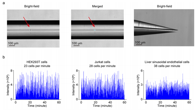 该方法实现了25-40个细胞每分钟的高通量检测速度,更重要的是使用该方法具有高达94.3%的单细胞事件率,根据高速摄像机的拍摄显示,在毛细管内观察到的88个细胞事件中,有83个被确认为单细胞事件(图2a,b)。