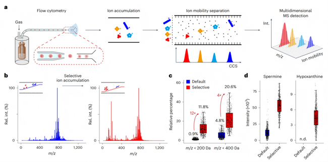 事实上基于质谱技术与流式细胞技术整合的质谱流式技术已经在单细胞分析中崭露头角,然而单纯的质谱流式技术在检测的灵敏度、稳定性和覆盖深度方面存在巨大挑战。由于单细胞中代谢物的浓度通常会低至10¯18 mol,极低的浓度导致质谱仪采集到的信噪比(signal-to-noise ratios, SNRs)极低,进而影响代谢组学检测的灵敏度和稳定性。而离子淌度技术(ion mobility, IM)能够根据代谢物离子的大小,形状以及碰撞截面积(collision cross-section, CCS)将代谢物的离子在气相中预先分离,更重要的是IM分离前的选择性离子积累,能够大幅增强代谢物离子的信号同时减少其他细胞组分对信号的干扰。研究团队将这两大模块创造性的结合在一起,开发了离子淌度质谱流式技术(图1a)。