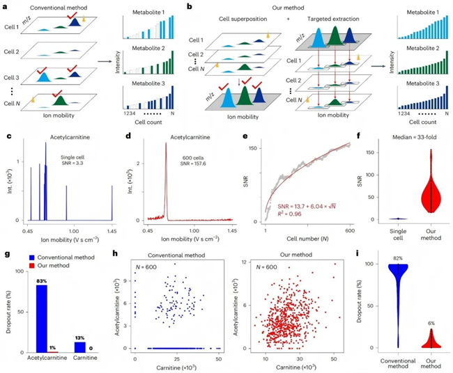 然而单纯的提高灵敏度并不能完全解决问题,极低的SNRs会进一步放大噪音信号对数据的影响,导致大量缺失值,最终使得数据难以精确分析(图3a)。为了解决这个问题研究团队开发了一种基于细胞叠加的技术路线,实现了在保持细胞异质性特征的基础上,提升单细胞代谢物检测的稳定性(图3b)。主要包括两步:(1)通过细胞叠加实现稳定的峰检测;(2)在单个细胞中对检测到的峰进行靶向提取。如乙酰肉碱在叠加了600个细胞的信号后,其SNR从3.3提升到了157.6(图3c,d),通过这样的方法,研究团队观测到,在100个测试的代谢物中SNR的中位数提升了33倍(图3f)。经过细胞叠加后,再对单个细胞中代谢物进行靶向提取,就能够显著降低代谢物的缺失率,同样以乙酰肉碱为例,其缺失率从83%降低到了1%(图3g),对于整体100个测试代谢物的缺失率从82%降低至6%(图3i)。