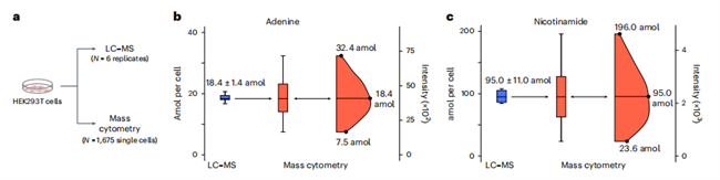 在解决了代谢物鉴定的问题后,研究团队为了进一步评估本方法对于代谢物定量的灵敏度,将同一份细胞样本提取后分为两份,分别进行传统LC-MS代谢组学技术与单细胞代谢技术分析(图5a)。LC-MS检测数据表明,细胞中腺嘌呤的含量为18.4±1.4 amol/细胞,这与单细胞代谢技术测得的腺嘌呤中位值相符,通过数据换算得到单细胞代谢技术测得腺嘌呤浓度为7.5-32.4 amol/细胞(图5b),通过计算SNR,预估本方法对于腺嘌呤得检测限为8.2 amol/细胞,使用同样的方法研究团队分析了烟酰胺、精氨酸和丙氨酸在单细胞中得浓度,其检测限分别为54.7 amol/细胞、0.9 fmol/细胞和2.8 fmol/细胞(图5c)。根据此前的研究报道96%的代谢物在细胞中的浓度大于1 amol/细胞,使得大多数代谢物都可能使用本研究的技术被检测到。