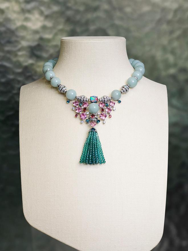 这款项链巧妙混搭翡翠圆珠、尖晶石、碧玺、欧泊与钻石等不同材质,通过几何图伟德国际吧案与考究的镂空设计,呈现丰饶华美而又巧妙平衡的效果。近乎植物般的色调与有机形态的宝石形成呼应,悬垂而下的流苏更显灵动优雅。