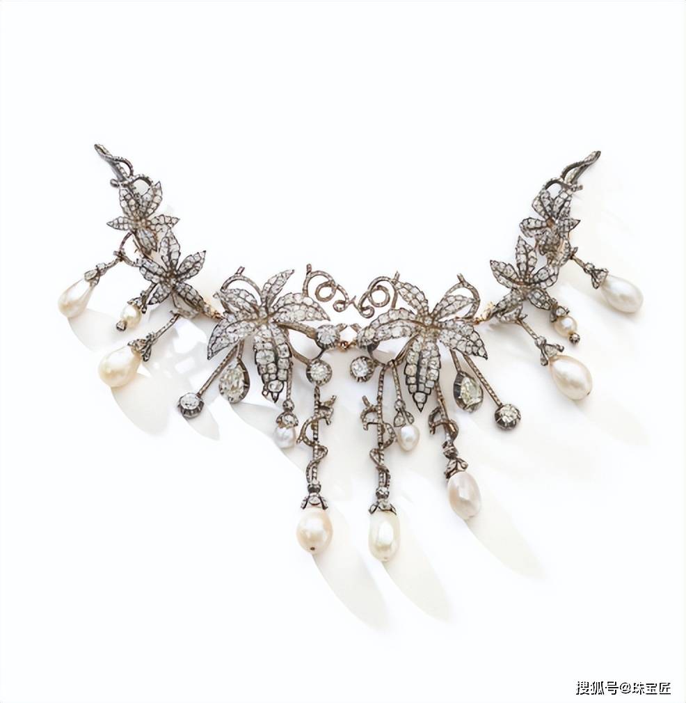 1840年,库尼贡德的后人用这些珍贵的天然珍珠,打造了这条华丽、唯美的藤蔓项链,1860年时,又打造了配套的珍珠钻石胸针,并作为传家宝在家族内世代传承。