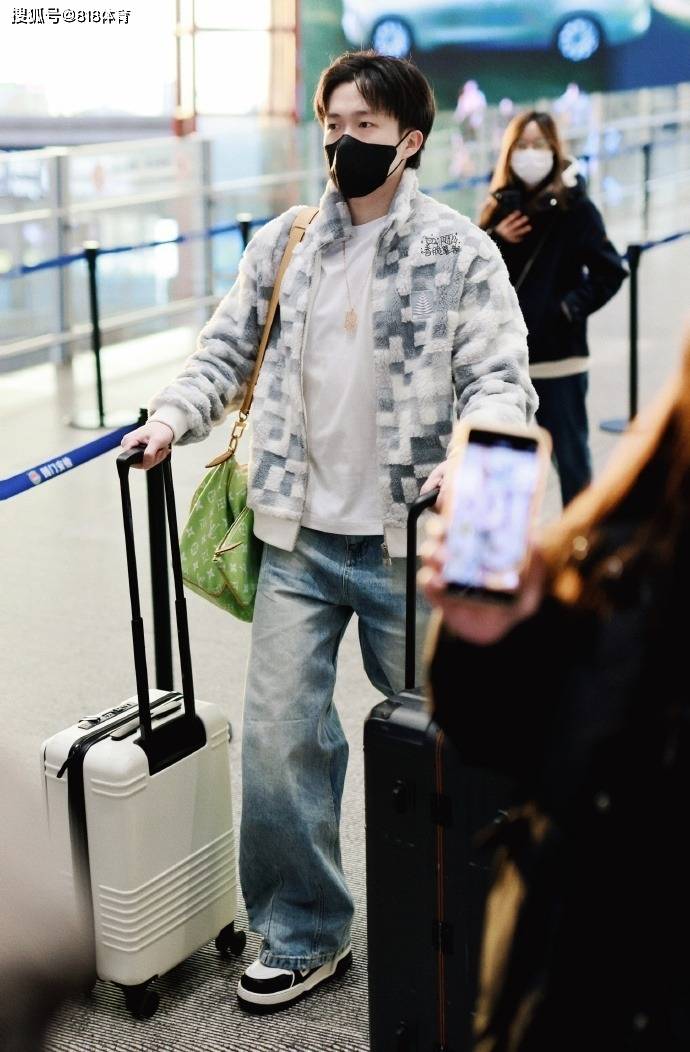 王楚钦梳着小分头,佩戴黑色口罩,两只手各推着一个行李箱,还背着伟德国际bv1946一只LV的绿色包包,气定神闲。