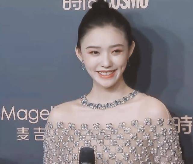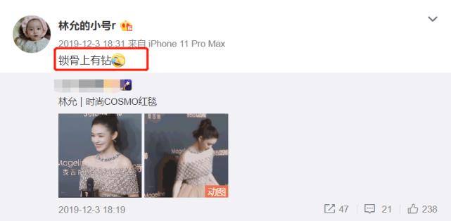 香槟色的礼服看起来十分雅致,这一字肩的设计也是将林允的身材展现得淋漓尽致,精致的骨架真是让人羡慕。林允笑起来的时候甜甜的,真的是艳惊四座的装扮。在活动结束后,林允还特地转发微博,不仅秀一下自己的美照,还提醒网友们,“锁骨上有钻”。