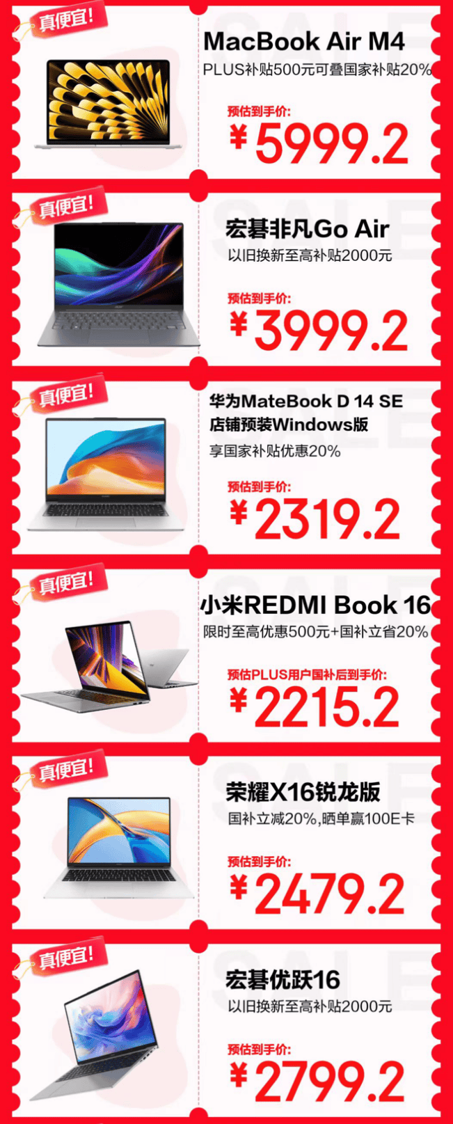 针对学习办公群体,京东618同样提供超值电脑好物。MacBook Air M4以1.24kg超轻机身和18小时续航,堪称轻量化办公的好帮手,PLUS补贴叠加国家补贴后,预估到手价5999.2元。宏碁非凡Go Air,999克超轻机身搭载32G大内存,实现高效移动办公,到手价3999.2元。预算有限的学生党,则可以考虑华为MateBook D 14 SE、小米REDMI Book 16、荣耀X16锐龙版、宏碁优跃16,叠加国家补贴及京东优惠,最低2215.2元起,完美适配网课学习和移动学习场景。