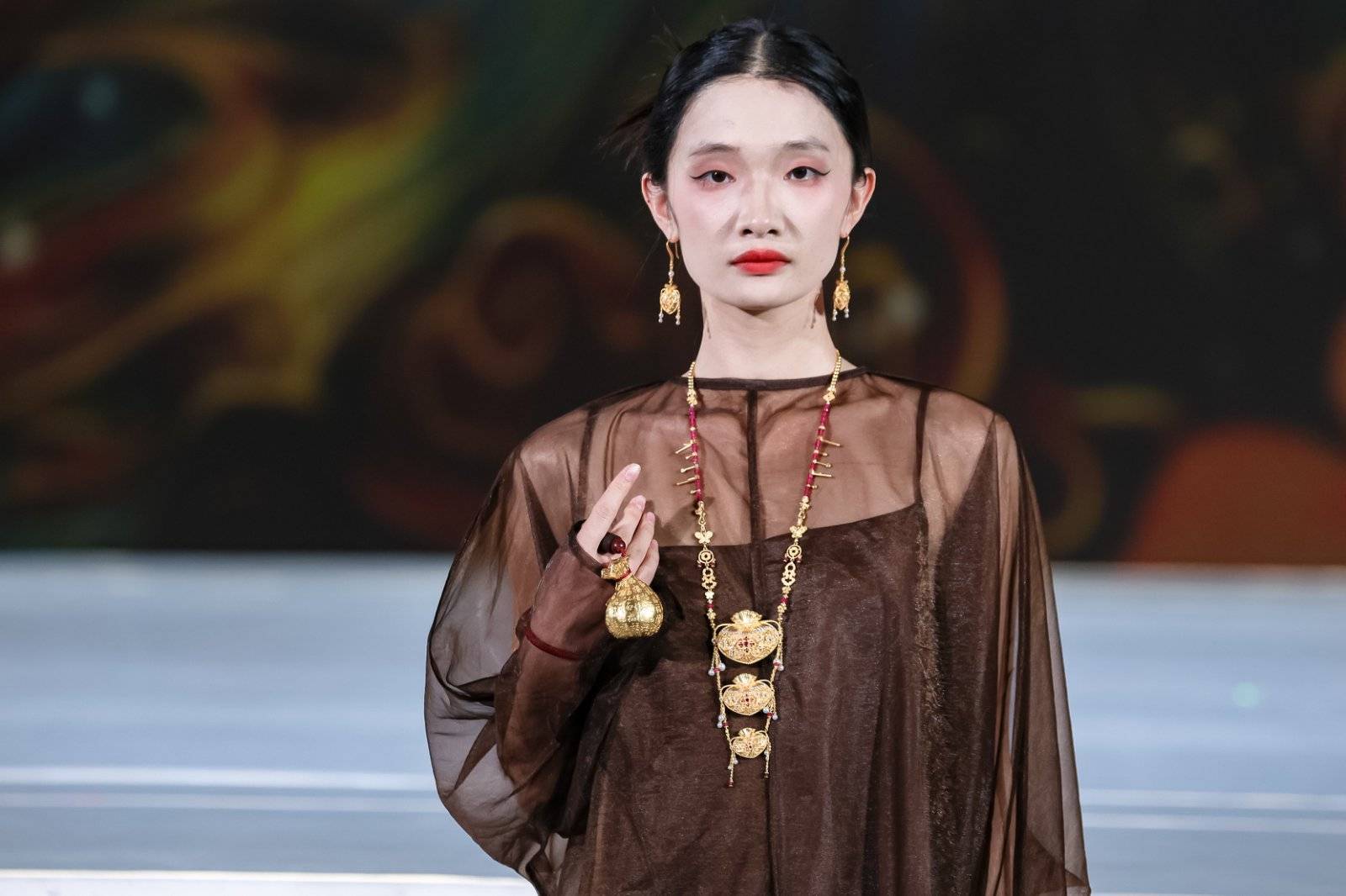 界面新闻在老凤祥大秀现场看到,整个走秀分为“未来之问”、“盛唐风华”和“极致新生”三大篇章。通过这场珠宝光影大秀,老凤祥正式对外宣布2025年度重磅作品:“藏宝金”系列、“凤祥喜事”系列,以及马年生肖新品“奇骥”系列的多款新作。