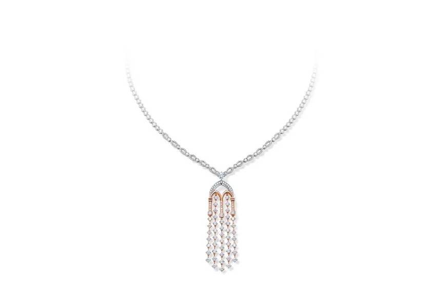 尚美巴黎这款项链的设计灵感源自于白鹭的标志性V形姿态,将自然界的灵动之美与珠宝的璀璨光华完美融合,展现出一种超凡脱俗的优雅气质。项链的中心镶嵌着一颗梨形钻石,这是Joséphine系列的标志性设计元素,它如同晨曦中的露珠,散发着柔和而迷人的光芒。隐藏式的戒托设计巧妙地突出了钻石的亮度和光彩,使得整颗钻石仿佛悬浮在空中,为作品增添了一抹轻盈与灵动。