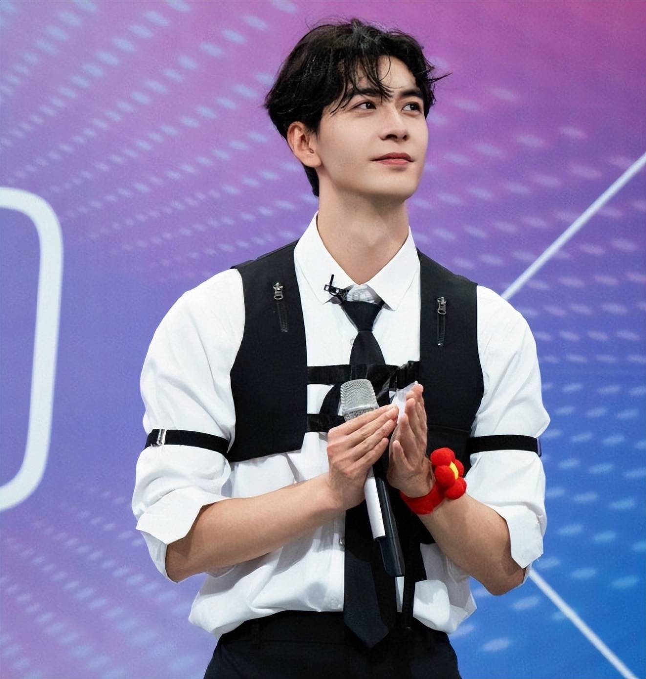 在《你好星期六》节目中,陈星旭的造型也给人一种意外的惊喜。他的穿着并非通常的霸气风格,而是选择了马甲与衬衫的简约搭配,配上束带设计,显得既有创意又突出了身材。微卷的刘海与精致的发型,更是展现出绅士风度。陈星旭笑容灿烂,眼神清澈,给人一种阳光大学生般的亲和力,毫不逊色于他在剧中的“李承鄞”形象。